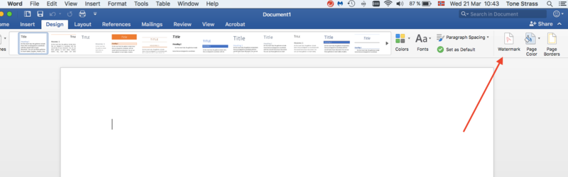 - Gå til fanen Design, finn valget for Watermark/ Vannmerke